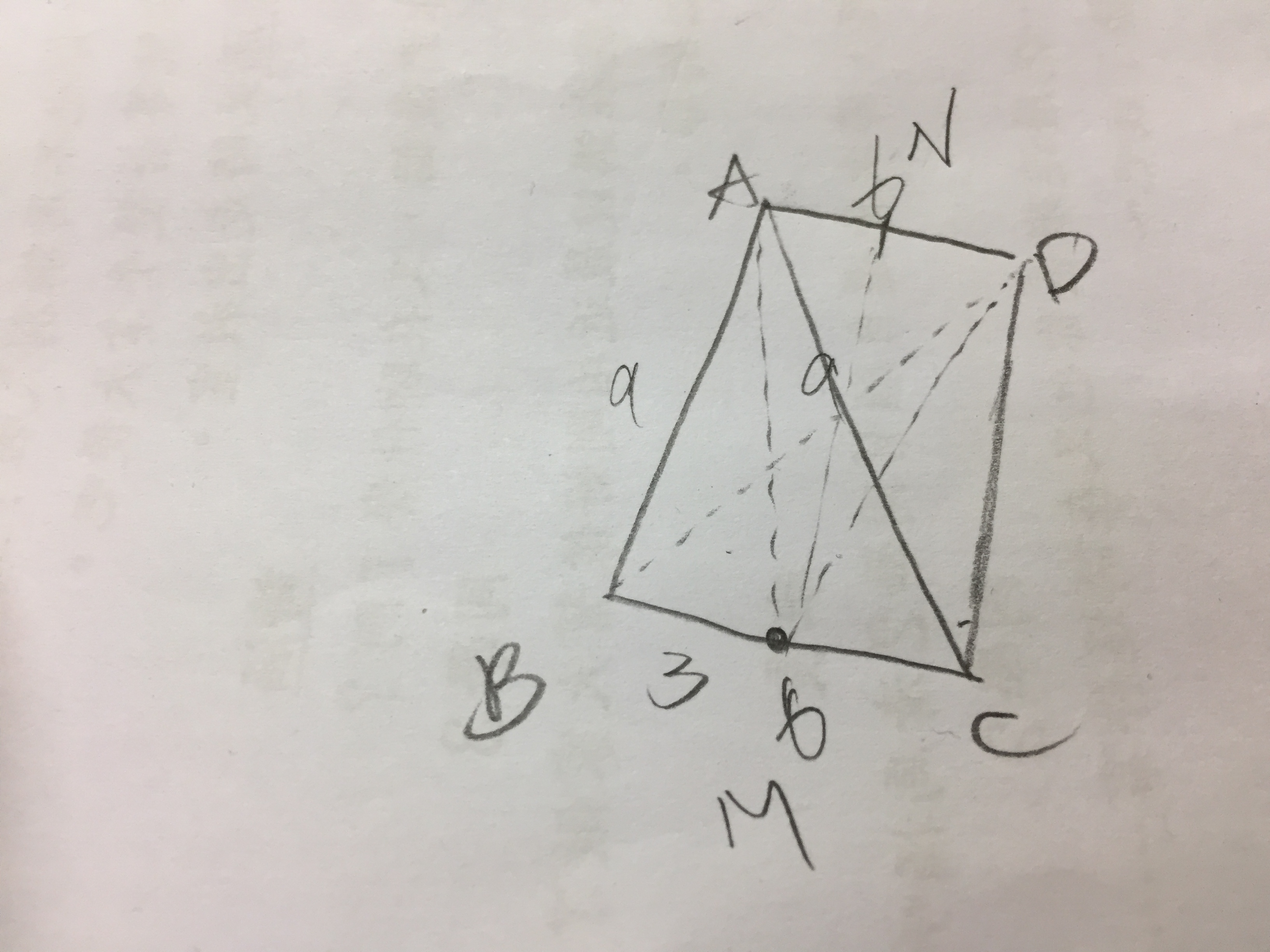 設\(\overline{BC}\)中點為\(M\)、\(\overline{AD}\)中點為\(N\)、高為\(h\)