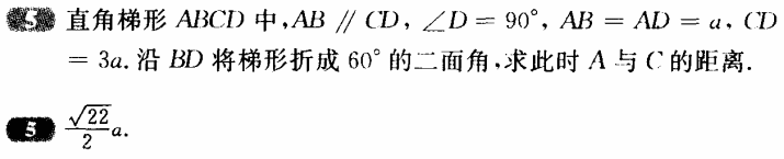 直角梯形ABCD中,\( \overline{AB}// \overline{CD} \),\( ∠D=90^o \),\( \overline{AB}=\overline{AD}=a \),\( \overline{CD}=3a \),沿\( \overline{BD} \)將梯形折成\( 60^o \)的二面角,試求:此時A與C的距離為?